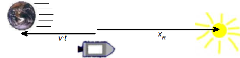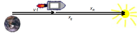 Anschließend berechnen beide aus ihren Werten, was der jeweils andere Beobachter gemessen hat. Lösung klassisch:Klassisch wäre die Lösung ganz einfach (siehe Bild oben): $x_R = x_E - v\cdot t$ $x_E = x_R + v\cdot t$ relativistisch: Berechnung von $x_R$Wir betrachten die Situation zunächst aus Sicht des Beobachters auf der Erde. Aufgrund der Zeitdilatation gilt dann: $\quad t_R = t_E\sqrt{1-\frac{v^2}{c^2}}\quad$. Aus dem von dem Beobachter auf der Erde gemessenen Wert $x_E$ soll nun $x_R$ berechnet werden. Für den Beobachter auf der Erde ist die Zeit $t_E$ vergangen. Aus seiner Sicht hat die Rakete den Weg $v\cdot t_E$ zurückgelegt und ist noch $x_E - v\cdot t_E$ vom Stern entfernt (Das entspricht genau der klassischen Lösung oben). Da der Beobachter auf der Erde mit der Relativitätstheorie vertraut ist, weiß er, dass für den bewegten Beobachter in der Rakete die Strecke verkürzt ist (Längenkontraktion). Also rechnet er: (Gleichung 1) $x_R = \left(x_E - v\cdot t_E\right)\sqrt{1-\frac{v^2}{c^2}} = x_E\sqrt{1-\frac{v^2}{c^2}} - v\cdot t_R$